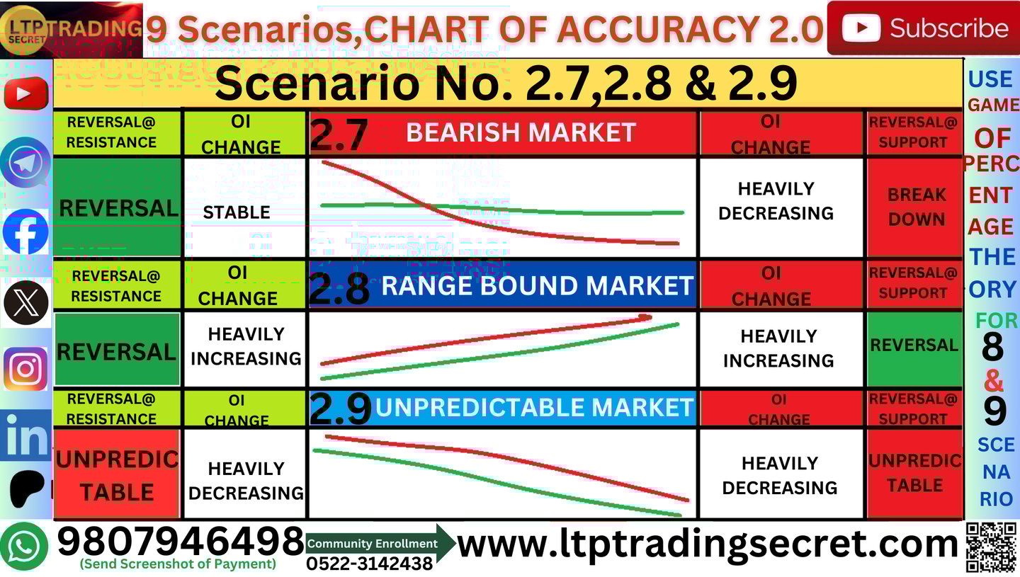 12Scenario 2.8 मे call side का open interest और put side का open interest दोनों heavily increase हो रहे हैं ये बड़ा मजेदार scenario है call side भी heavily increasing और put side भी heavily increasing यह scenario आपको सुबह-सुबह लगभग 9.15 से 9.30 am तक देखने को मिलता है दोनों speed मे बढ़ रहे हैं ऐसे case मे हमें दोनों तरफ से reversals मिलते हैं जब सपोर्ट मिलेगा तो वहाँ से भी खटाक से मार्केट ऊपर की तरफ चला जाएगा और resistance मिलेगा तो खटाक से वापस आएगा,दोनों तरफ से trade मिलते हैं यह scenario 9.45 तक प्रायः देखने को मिलता है जब दोनों race मे होते हैं|